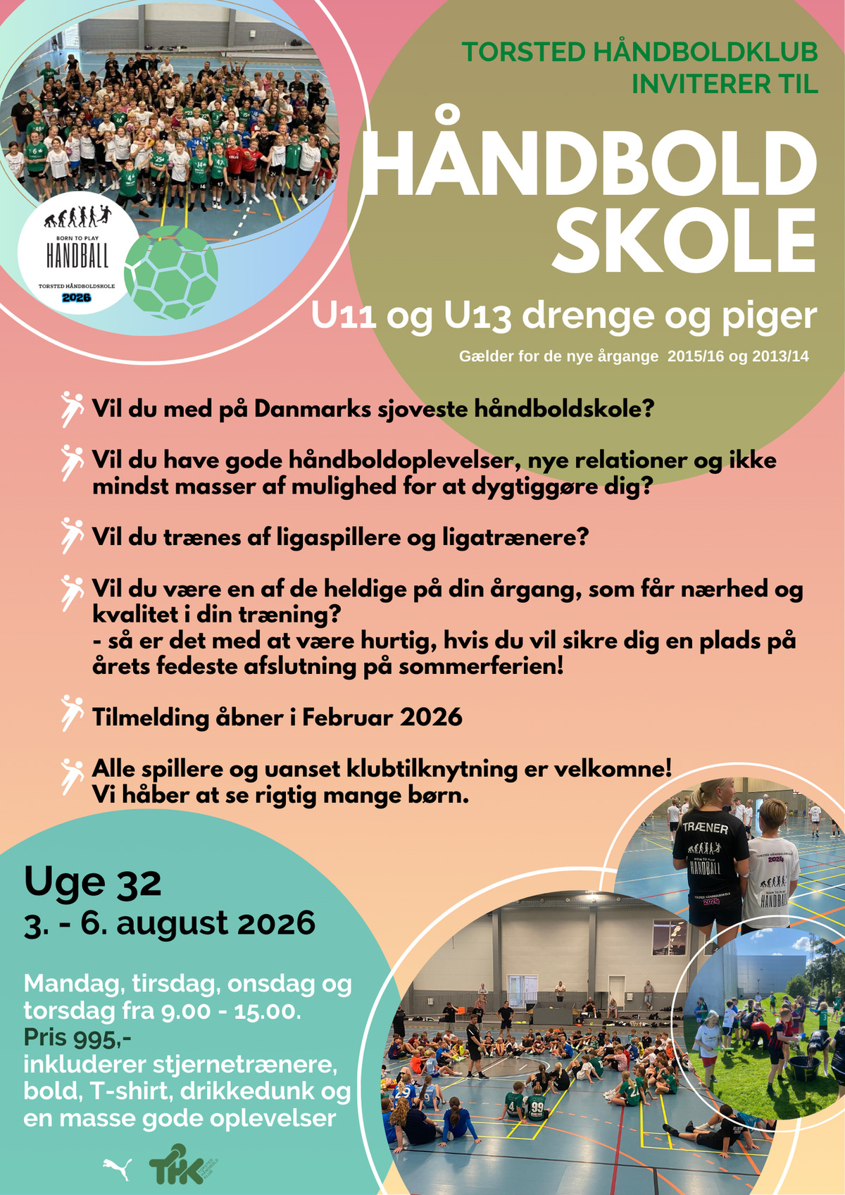 Tilmelding er åben fra 2. februar 2026 kl. 10 ( Begrænset antal pladser pr. årgang ) - Hvis der er spørgsmål så skriv til haandboldskole@torstedhk.dk
